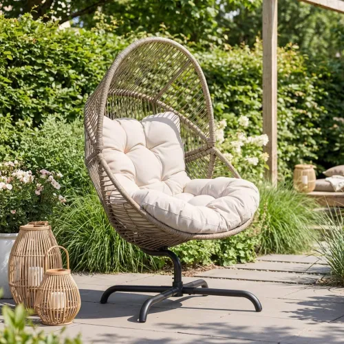 Відчуйте справжню динаміку відпочинку! Чотири променева основа з функцією оберту на 360° дозволяє вам миттєво змінювати ракурс: ловити перші промені сонця, спостерігати за дітьми на подвір'ї або розвертатися до співрозмовника, не встаючи з місця. Це обертове крісло-кокон дарує відчуття польоту та абсолютної свободи рухів, якого так не вистачає у звичайних кріслах.